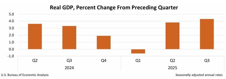 미 상무부는 3분기 미국의 국내총생산(GDP) 증가율이 4.3%(전기 대비 연율)로 집계됐다고 23일(현지시간) 밝혔다. 이는 분기 기준으로 지난 2023년 3분기(4.7%) 이후 2년 만에 가장 높은 성장률이다. 다우존스가 집계한 전문가 전망치(3.2%)도 큰 폭으로 웃돌았다.