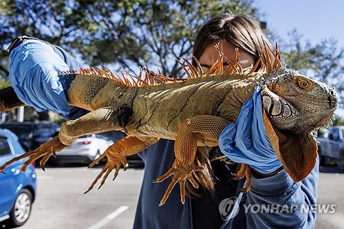 (서울=연합뉴스) 임화섭 기자 = 따뜻한 겨울로 유명한 미국 플로리다주를 덮친 이상 한파에 외래종 이구아나 수천마리가 떼로 기절해 나무에서 떨어졌다가 결국 야생동물 관리당국에 의해 집단 안락사를 당하는 서글픈 운명을 맞았다.