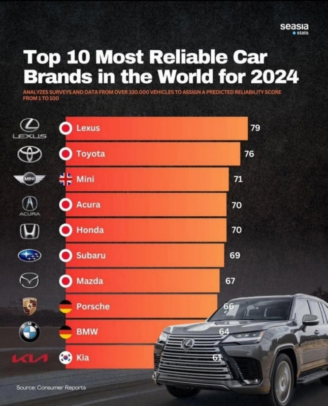 최근 발표된 ‘글로벌 자동차 신뢰도 조사’에 따르면, 지난해 기준으로 렉서스가 전체 브랜드 중 가장 높은 신뢰 점수를 기록했다. 이어 도요타, 미니, 애큐라, 혼다, 수바루, 마즈다가 상위권에 올랐다.