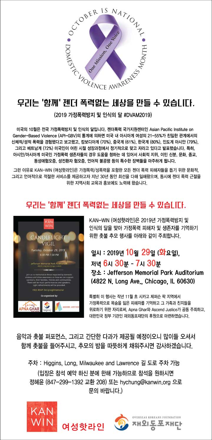가정폭력방지 및 인식의 달인 10월을 맞아 여성핫라인(KANWIN)이 가정폭력 피해자 및 생존자를 기억하기 위한 촛불 추모행사를 갖는다.