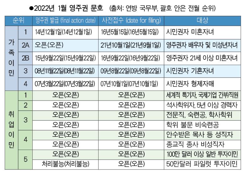 연방국무부가 17일 발표한 2022년 1월 영주권 문호에 따르면 가족이민은 오픈 상태를 유지하고 있는 영주권자 배우자 및 미성년 자녀(2A) 순위를 제외한 모든 부분에서 넉 달째 전혀 진전을 이루지 못하고 있다.