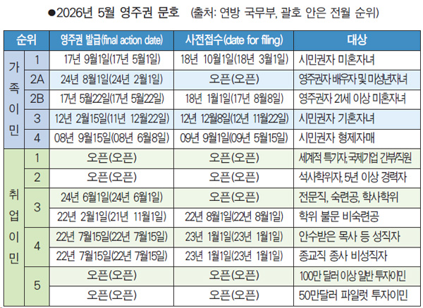 연방 국무부가 14일 발표한 2026년 5월 중 영주권 문호에 따르면 시민권자의 21세 이상 성년 미혼자녀들이 대상인 1순위는 영주권 판정 우선일자가 2017년 9월1일로 고지돼 전달에 비해 4개월 진전됐다. 또 지난달 동결되며 한걸음도 나아가지 못했던 영주권자의 배우자 및 미성년 자녀가 대상인 2순위 A는 2024년 8월1일로 6개월 빨라졌다.