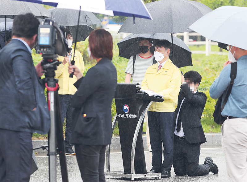 27일 충북 진천 국가공무원인재개발원 정문 앞. 쏟아지는 빗줄기 속에 아프가니스탄 특별기여자 지원방안 등을 브리핑하는 강 차관의 바로 뒤엔, 10여분 내내 바닥에 무릎을 꿇은 채 우산을 씌워주는 한 직원이 있었다.