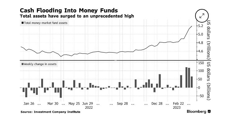 미국에서 금리가 5%를 웃돌면서 머니마켓펀드(MMF)에 자금이 몰리고 있다고 블룸버그 통신이 3일 보도했다.