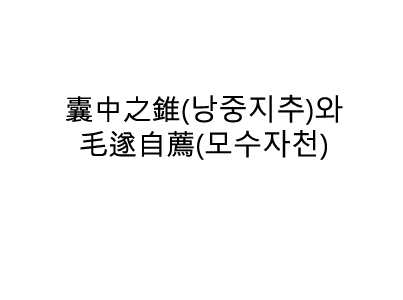 낭중지추(囊中之錐)란 말은 ‘주머니 속의 송곳’이란 뜻으로 ‘인재(人才)는 위기(危機)에 빛을 발하고 그 능력(能力)을 숨기려 해도 드러나기 마련이다.’라는 뜻입니다. 또 모수자천(毛遂自薦)은 모수라는 사람이 자기 자신을 추천했다는 말입니다. 그러면 이 말이 생겨난 연유를 살펴보면 옛날 중국 조(趙)나라에 평원군(平原君)이라는 사람이 있었는데, 그는 전국시대(戰國時代)(B.C 403 – 221) 4군자(四君子)라 불리는 제(齊)나라 맹상군(孟嘗君), 위(魏)나라 신릉군(信陵君), 초(楚)나라 춘신군(春申君)이 있었으며, 조(趙)나라에는 평원군(平原君)이 있었던 때의 일입니다. 이때 강대국인 진(秦)나라가 조(趙)나라의 서울인 한단(邯鄲)을 포위하고 위협을 가하자 조나라 조정에서는 급히 초(楚)나라에 평원군을 보내 도움을 청하는 동시에 아예 합종(合從)을 맺고자 했는데, 이때 수행원을 20여명 정도 대동하고 출발하기로 하고 식객 중에 학문도 깊고 용기도 높은 자를 선발하려고 모집을 했으나 19명까지는 어렵지 않게 선발했는데 나머지 한 명을 쉽게 구할 수가 없었습니다. 이때 식객 중에 <모수>(毛遂)라는 사람이 스스로 자신을 추천하고 나섰는데, ‘지금 공자께선 초(楚)나라와 합종을 맺기 위해 부족한 점이 있는 것으로 압니다. 제가 일행에 같이 갈 수 있겠습니까?’ 평원군은 의아해서 그를 쳐다보며, ‘당신은 내 집에 온지 몇 해나 되었소?’ ‘3년 정도 되었습니다만…’ 그러자 평원군은 ‘현명한 사람은 마치 주머니 속의 송곳(囊中之錐)과 같아서 송곳 끝이 주머니를 뚫고 나오듯 금방 세상에 알려지는 법이라오.’ 그런데 당신은 내 집에 3년이나 계셨지만 나는 한 번도 당신을 칭찬하는 말을 들어 본 적이 없었소. 그것은 곧 당신이 별 재주가 없다는 뜻이지요. 그러니 이번에는 같이 갈 수가 없소. 다음 기회를 봅시다. 모수는 지지 않고 ‘저는 오늘에야 비로소 주머니 속에 넣어 주십사고 청하는 것입니다. 제가 처음부터 주머니 속에 있었더라면 자루까지 주머니를 뚫고 밖으로 나왔을 것입니다. 그까짓 송곳 끝이 문제입니까?’ 이렇게 해서 어차피 한 명이 부족하므로 일행에 끼워주기로 했는데, 19명의 수행원들도 그를 무시하며 업신여겼습니다. 그러나 목적지 까지 가는 동안 많은 토론을 벌이며 협상에 대해 논의를 한 결과 모수의 탁월한 언변과 식견에 두 손을 들고 말았습니다. 드디어 평원군은 초나라 왕과 만나 협상을 시작했는데 한나절이 지나도록 아무런 결론을 얻지 못 하고 지지 부진했습니다. 이에 이제는 모수가 나설 차례가 되었다고 모두가 이구동성 그를 떠다밀므로 그는 단숨에 회의장으로 뛰어들어 초(楚)나라 왕에게 아주 가까이 다가가서 위협적으로 ‘합종을 할 것이냐 말 것이냐는 단 두 마디면, 결정될 일인데 지금 해가 뜰 무렵부터 시작하여 해가 중천에 떠 있는데도 결정을 내지 못하다니 이게 말이나 됩니까?’ 깜짝 놀란 왕은 ‘아니 저 사람은 누구요?’ 평원군은 ‘예, 저의 식객으로 있는 모수라는 사람입니다.’ 모수는 그의 뛰어난 언변으로 합종은 양국의 모두 이익이 된다고 강조하여 마침내 합종의 맹약(盟約)을 맺었는데, 황제와는 소나 말, 제후는 개나 돼지, 대부이하는 닭의 피를 사용했습니다. 여기서 낭중지추(囊中之錐)라는 말과 모수자천(毛遂自薦) 이라는 말이 생겨났으며 19명의 일행 모두 함께 맹약을 확인 했습니다.