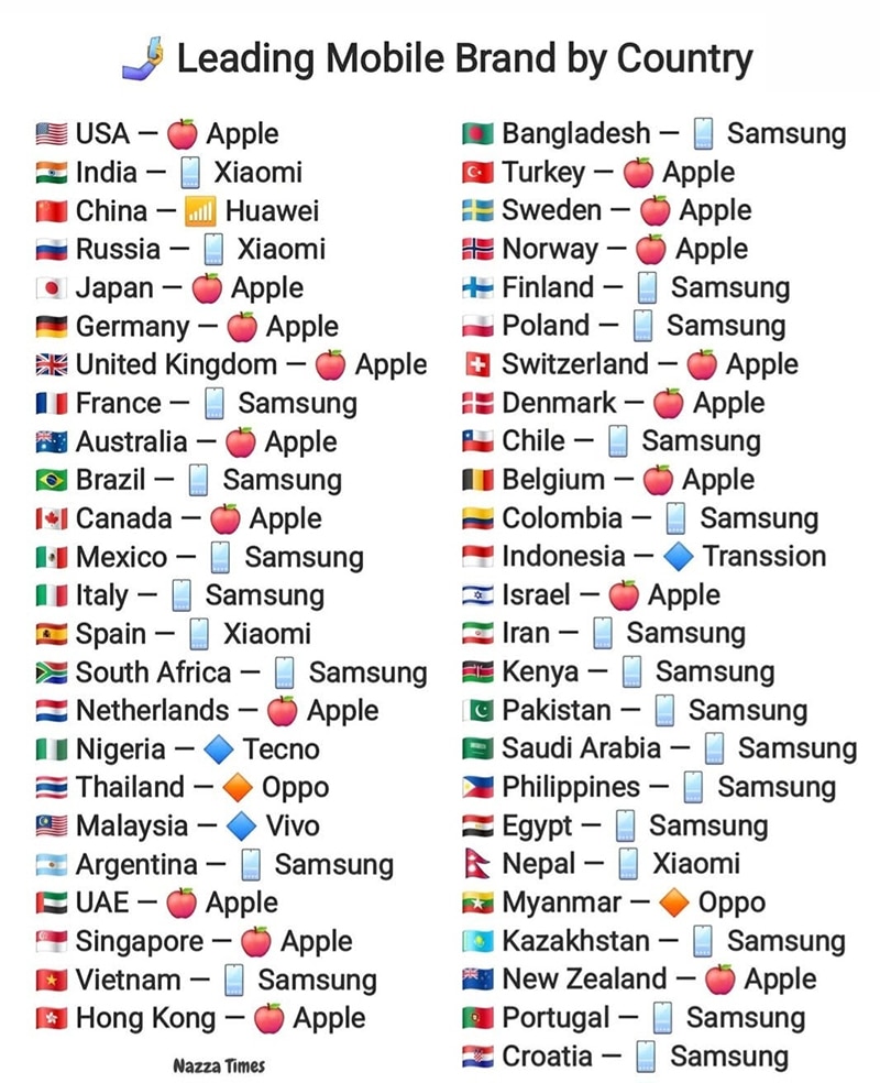 반면 삼성(Samsung)은 포르투갈, 이집트, 멕시코, 브라질, 아르헨티나, 남아프리카공화국, 케냐, 베트남, 파키스탄, 이란, 필리핀, 크로아티아 등에서 확고한 강세를 보인다.