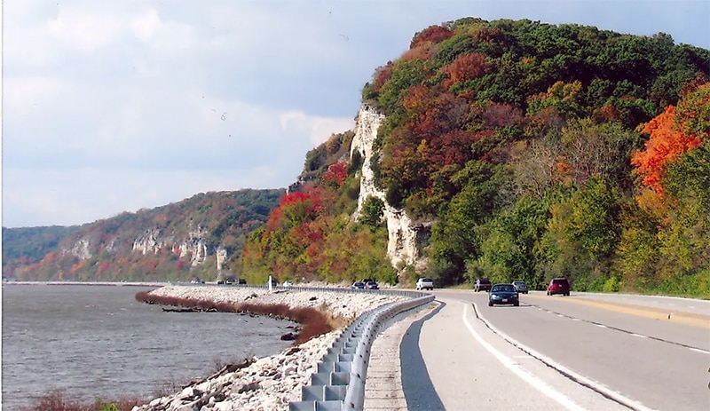 먼저 미시시피·일리노이·미주리 강이 만나는 구간인 ‘그레이트 리버스 경관도로(Meeting of the Great Rivers Scenic Route)’다. 33마일에 걸쳐 강변 절벽과 이어진 마을 풍경이 이어지며, 일리노이 7대 절경 중 하나로 꼽힌다. 하트퍼드에서 출발해 알턴과 그래프턴을 지나 페레 마르케트 주립공원(Pere Marquette State Park) 전망대에 오르면 세 강이 합류하는 장관을 감상할 수 있다. 또한 12월부터 3월 사이에는 강변 나무에 앉아 있는 흰머리독수리를 가까이서 볼 수 있는 명소로 유명하다.
