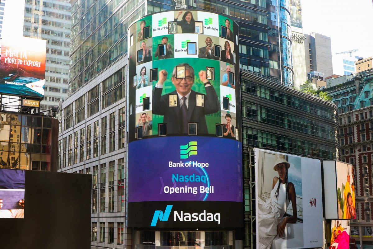 뱅크오브호프(행장 케빈 김)가 8월1일 출범 4주년을 기념해, 27일 나스닥 거래 시작을 알리는 오프닝벨을 울렸다.