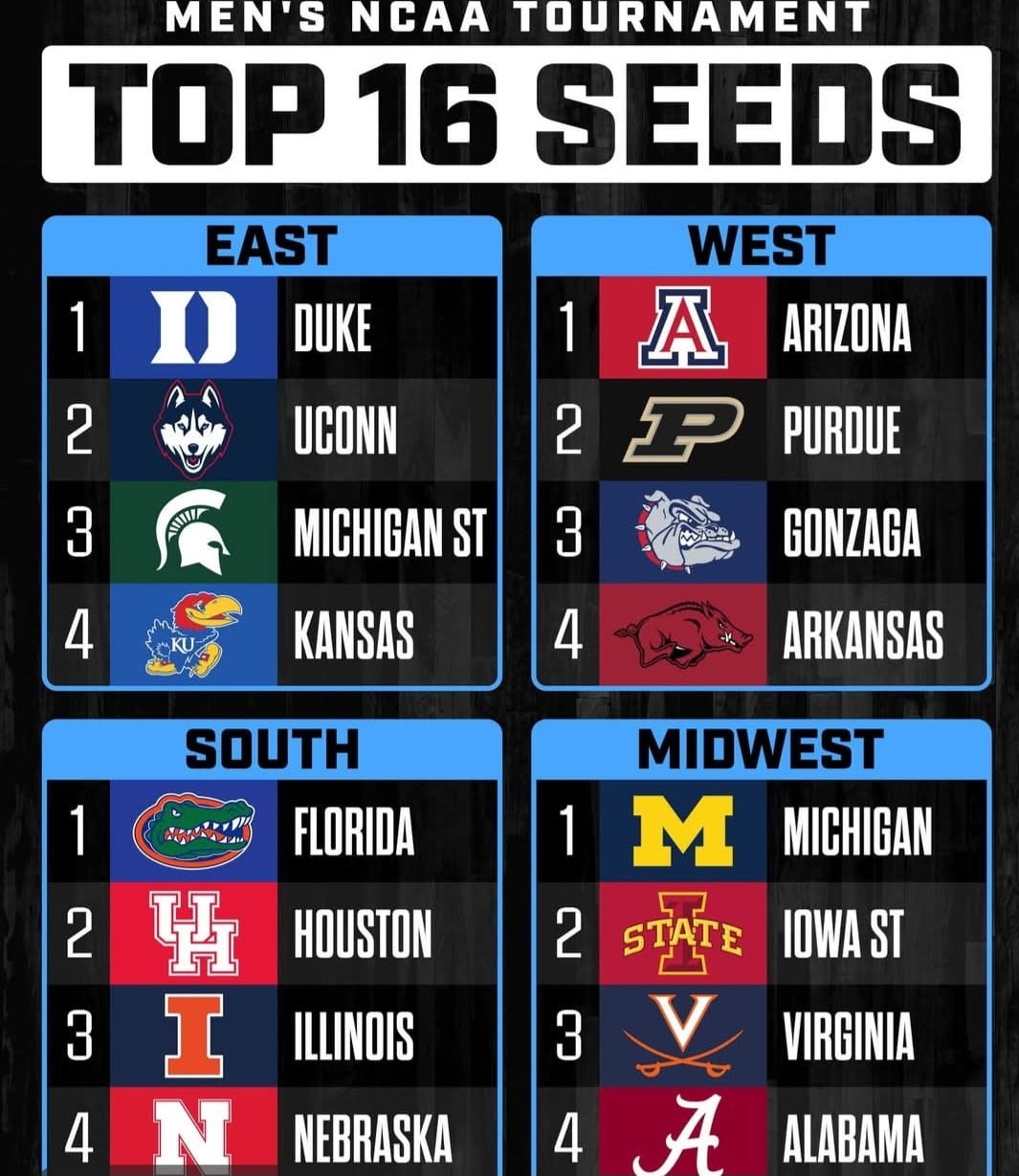 남자부 듀크·미시간·플로리다·애리조나 1번 시드