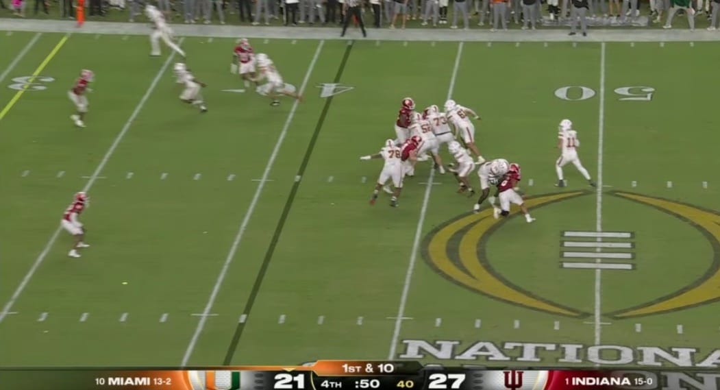 마이애미대는 4쿼터에 27대 21로 6점 차까지 따라붙으며 마지막 1분여를 남기고 공격을 시작했지만, 쿼터백의 패스를 인디애나가 인터셉트하면서 역전 기회를 놓쳤다.