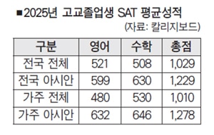 인종별로는 아시안 응시자의 평균 성적이 영어 599점, 수학 630점으로 총 1,229점을 기록했다. 이는 백인(1,077점), 히스패닉(928점), 흑인(904점) 등 타인종 응시자의 평균 성적을 월등히 앞서는 것이다. 또 아시안 응사자의 26%는 1,400점 이상의 고득점자로 나타났다.