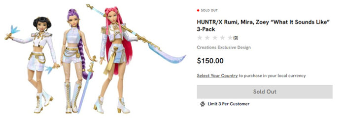 가장 화제가 된 것은 마텔의 한정판 전문 사이트 ‘마텔 크리에이션즈’에서 선보인 3종 한정판 세트(What It Sounds Like 3-Pack)다. 주인공 3인방이 모두 포함된 이 세트는 150달러라는 가격에도 불구하고 예약 판매 시작 직후 곧바로 ‘품절(Sold Out)’을 기록하며 케데헌의 폭발적인 인기를 입증했다.