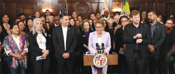 20일 LA 시청에서는 캐런 배스 LA시장과 시의원들이 나서서 연방 이민 단속 요원들이 법원의 영장이나 합리적 근거 없이 국 시민권자와 합법 이민자들을 불법적으로 체포 및 구금하고 폭력을 행사한 사건에 대한 연방 의회 차원의 즉각적인 조사를 촉구했다.