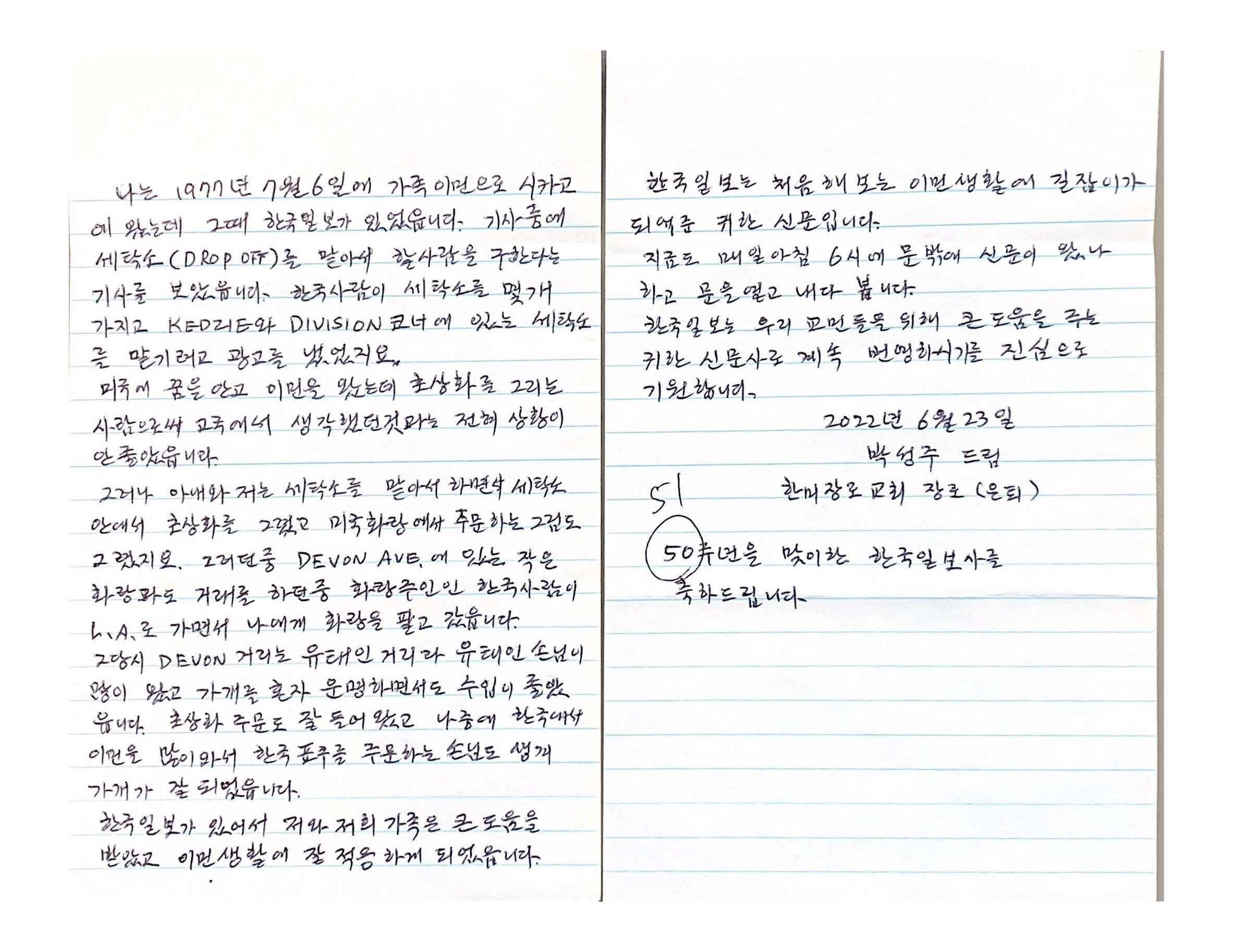 시카고 한국일보가 올해 51주년을 맞으며 뉴스 전달자로서의 역할에 고마움을 표시하는 많은 독자들의 의견이 쇄도하고 있다. 아래는 구독자가 보내온 편지의 전문.