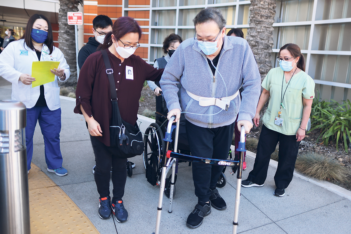 코로나19로 풀러튼 지역 세인트 주드 메디컬 센터에 5개월간 최장 입원했던 대니얼 김(48)씨는 16일 휠체어에 몸을 기댄 채 퇴원길에 올라 가족들과 병원 직원 30여명의 박수갈채를 받았다. 김씨는 아직 완치되지는 않았지만 회복단계에 접어들어 5개월 만에 집으로 돌아갈 수 있게 됐는데, “의료진분들의 노고 덕분에 죽었다 다시 살아날 수 있었다”며 감사의 인사를 전했다.
