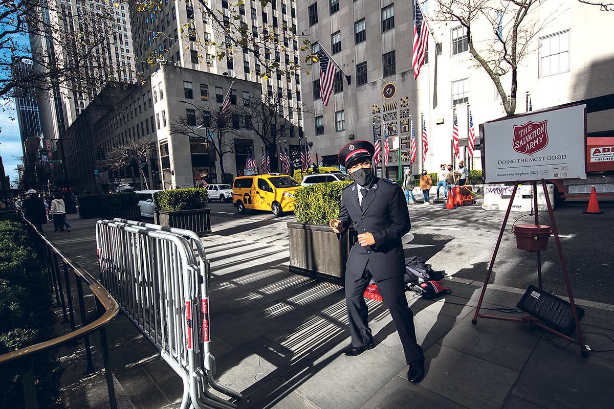 구세군 관계자가 뉴욕 록펠러 센터 앞에서 마스크를 쓴 채로 노래하며 모금 활동을 하고 있다.[로이터]