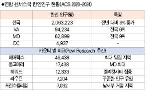 워싱턴 지역 한인인구는 버지니아가 9만4,234명으로 가장 많고 메릴랜드 6만2,899명, 워싱턴 DC 4,937명으로 집계됐다. 전국적으로 캘리포니아가 57만명으로 가장 많고 다음은 뉴욕·뉴저지가 26만명 그리고 워싱턴 지역(DMV)이 16만명으로 3위를 차지했다. 다음은 텍사스 13만명, 워싱턴 주 10만명, 조지아 8만명 등의 순으로 나타났다.