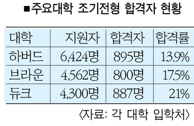 반면 브라운대는 조기전형 합격률이 17.5%로 역대적으로 가장 낮았다. 전년보다는 0.6%포인트 떨어졌다. 올해 조기전형 지원자는 전년보다 8% 늘어난 4,562명으로 이 중 800명이 합격했다.