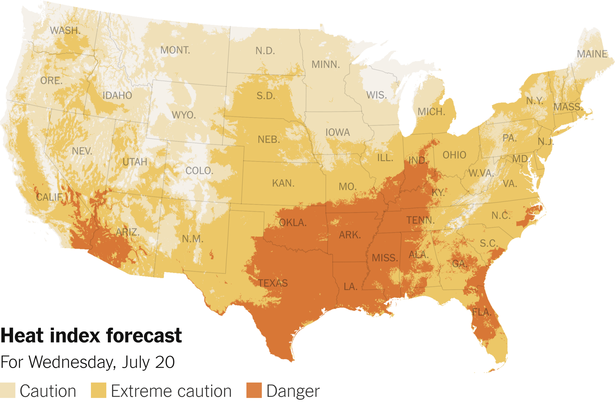 20일 미 전역 100만 명 가량의 시민들이 폭염 경보 및 주의보 영향권에 들며 기록적인 무더위를 견뎠다. “위험” 수준의 폭염 경보가 내려진 오클라호마 주와 텍사스 주의 일부 지역은 체감온도 115도를 기록하며 열사병, 일사병 등의 폭염 관련 응급상황이 급등한 것으로 나타났다.
