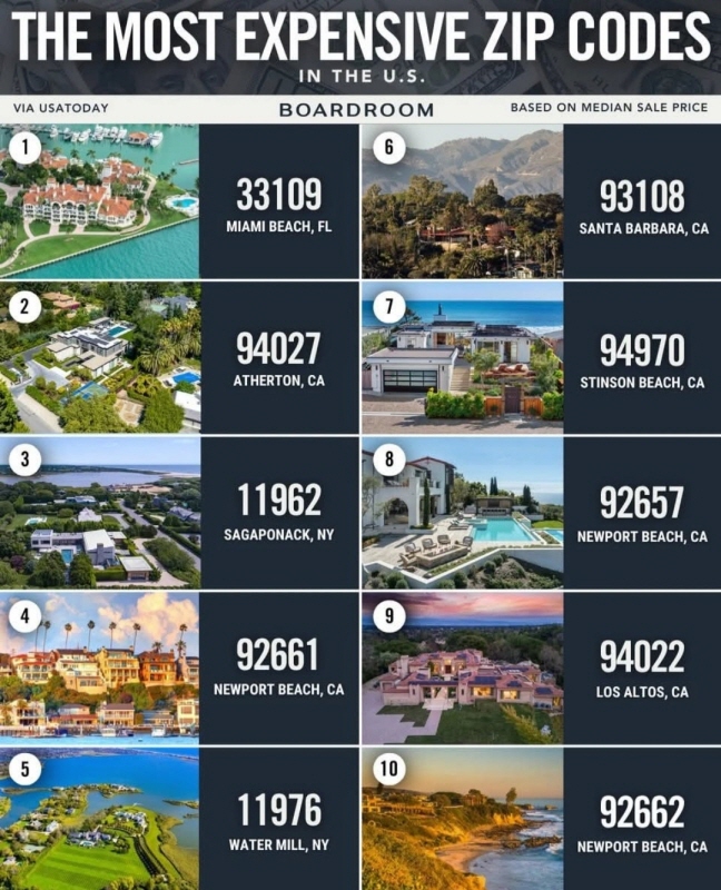 미국에서 집 값이 가장 높은 지역은 어디일까. USA 투데이는 전국 주택의 중간가를 비교해 우편번호(ZIP CODES) 기준으로 집값이 높은 상위 지역을 분석했다.