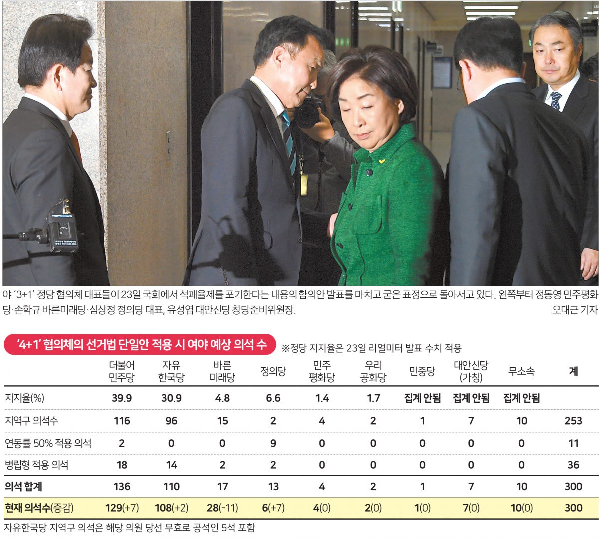 4+1의 단일안으로 총선을 치른다고 가정하고 현재 정당 지지율(여론조사 전문기관 리얼미터의 23일 발표치)을 적용해 집계한 결과, 민주당은 현재 의석(129석)보다 7석 증가한 136석을 차지한다. 정의당은 7석 늘어난 13석, 한국당은 2석 증가한 110석을 얻게 된다. 바른미래당은 11석을 잃어 17석에 그친다.