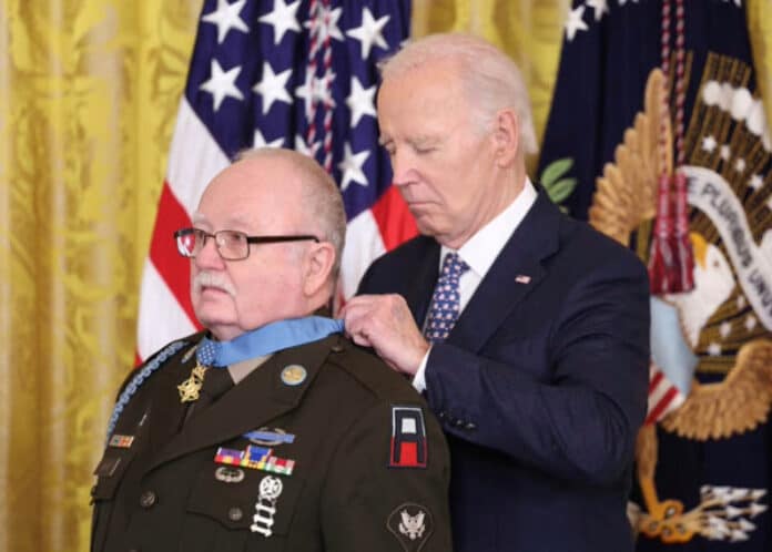 조 바이든 대통령이 3일 워싱턴DC 백악관에서 베트남전쟁 참전용사인 케네스 데이비드 일등병에 명예훈장을 수여하고 있다. 2025.1.3 [로이터]