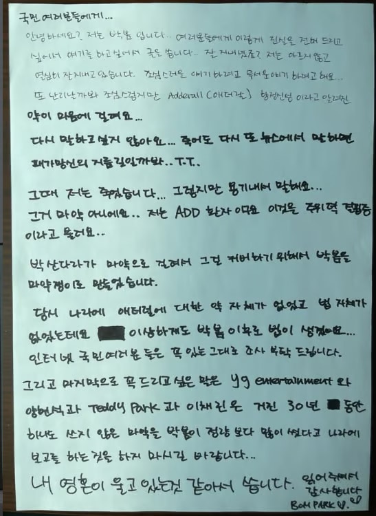 박봄은 3일(이하 한국시간) ‘국민 여러분들에게’로 시작되는 장문의 손 편지를 적어 공개했다.