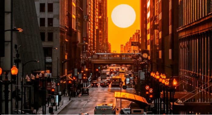 시카고 도심 마천루 사이로 태양이 일직선으로 정렬하는 시카고헨지(Chicagohenge) 현상이 이번 주말 절정을 맞는다. 매년 봄과 가을 춘분과 추분을 전후해 나타나는 이 현상은 자연의 신비와 시카고 특유의 도시 구조가 어우러져 만들어지는 장관으로, 도심 한복판에 눈 부신 빛의 통로를 형성하며 화려한 광경을 연출할 전망이다.