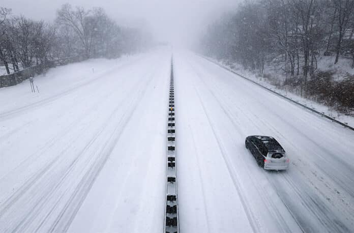 최악의 눈폭풍이 덮친 뉴욕주에서 25일 287번 고속도로가 온통 눈에 덮인 가운데 운행 차량이 없어 거의 텅 비어 있다. [로이터]