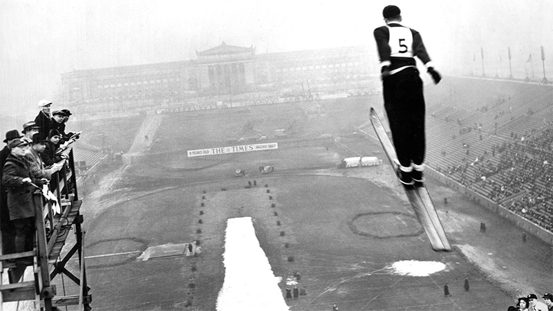 1938년 2월 솔저 필드에서 열린 스키 점프 대회는 특히 이례적인 장면으로 기록돼 있다. 당시 시카고는 평년보다 온화한 겨울을 맞아 눈이 부족했고, 현지 언론 보도에 따르면 대회에 사용된 눈은 미시간주 에스카나바(Escanaba)에서 직접 공수해 왔다. 시카고 역사박물관이 소장한 사진에는 당시 스키 점퍼 요르겐 요한센(Jorgen Johansen)이 임시 점프대에서 도약을 준비하는 모습이 담겨 있다.
