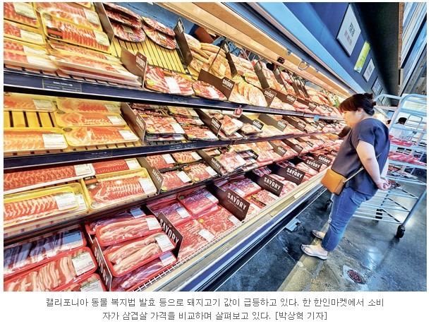 LA 한인타운에 거주하는 주부 김모씨는 요즘 마켓에 들러 삼겹살을 구매할 때마다 한숨이 나온다. 팬데믹 이전만 해도 파운드 당 2달러 대에 구매 가능했던 삼겹살이 팬데믹을 지나며 파운드당 5~6달러로 오르더니 이제는 파운드당 8~9달러 대까지 오른 것이다. 김씨는 몸 쓰는 일을 하는 남편이 퇴근 후에 삼겹살을 구워 소주를 마시는 것이 가장 큰 낙인 것을 알고 있어 오늘도 할 수 없이 삼겹살 3팩을 카트에 담으며 생각했다. “예전 갈비 값이네!!”