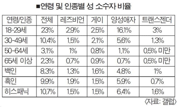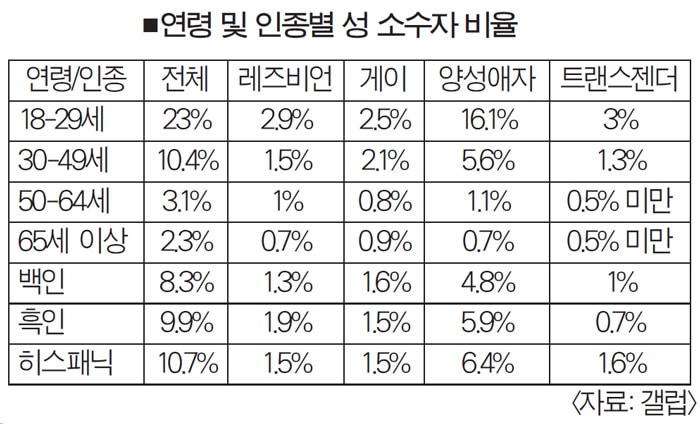 이번 조사에서 30세 미만 성인의 약 23%가 자신을 성소수자로 인식한다고 응답했다. 이는 30~49세(10%)와 비교해 두 배 이상 높은 수준이며, 50세 이상(3%)과 비교할 때는 무려 8배나 높은 수치다. 갤럽은 성소수자 정체성을 지닌 집단이 지난 10년간 빠르게 증가했는데, 젊은 성인층, 특히 젊은 여성들 사이에서 자신을 성 소수자로 인식하는 비율이 크게 높아진 것이 주 원인이라고 분석했다.