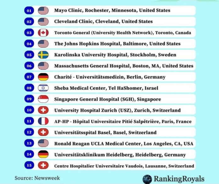 전 세계에서 가장 뛰어난 병원으로 미국 미네소타주의 메이요 클리닉(Mayo Clinic)이 꼽혔다. 2위는 오하이오주 클리블랜드 클리닉이 차지했다.