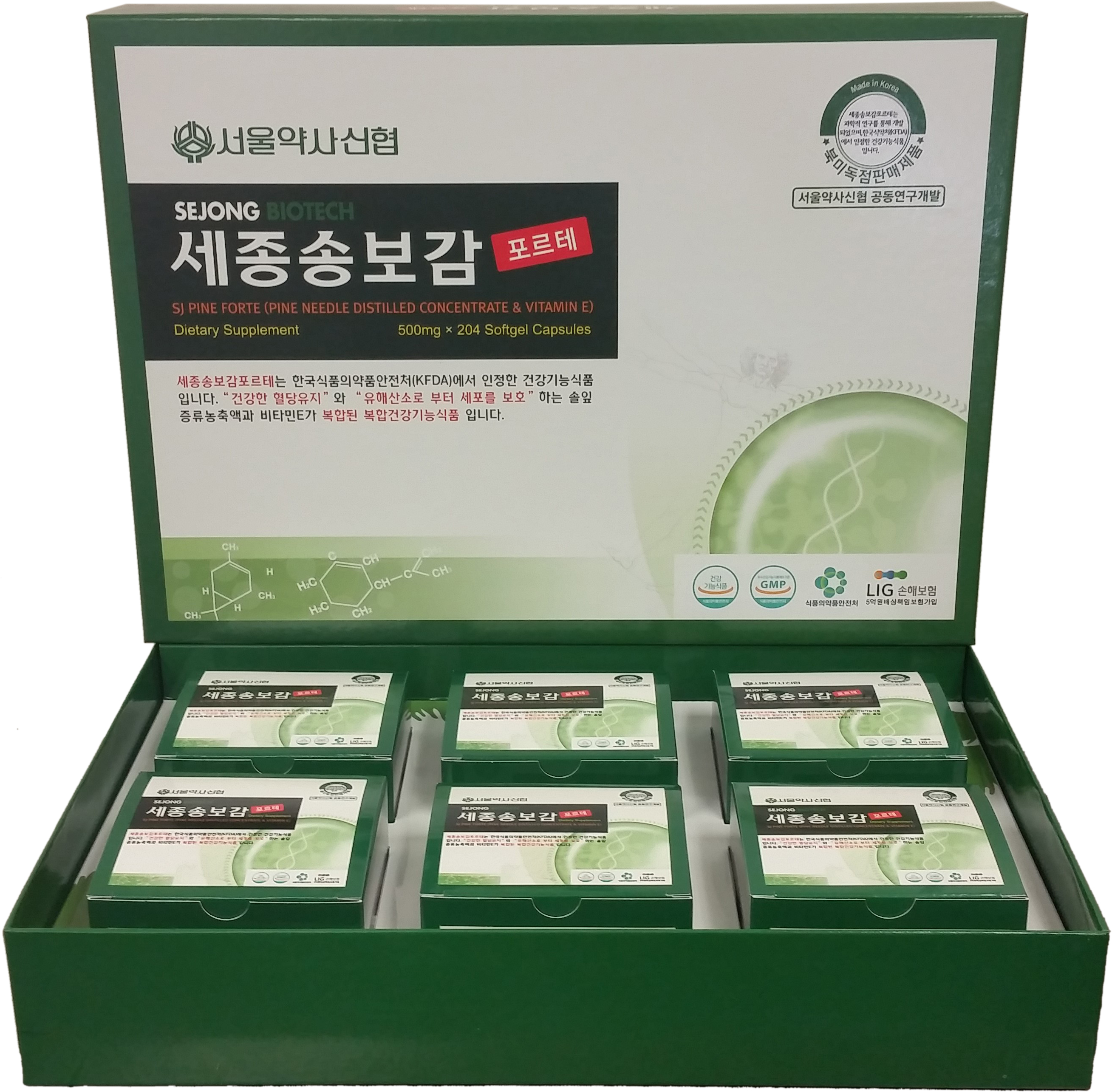 ‘세종송보감’은 한국식품의약안전처(KFDA)에서 인정받은 건강기능 식품이다. 이 제품은 혈관내의 혈액 찌꺼기, 콜레스트롤, 중성지방, 혈전을 조절·용해하여 몸 밖으로 배출하는 효능이 있는 솔잎을 사용하여 만들어졌다. 대부분의 현대인은 기름진 식습관, 운동부족으로 혈관내의 찌든 때를 청소하여 당뇨, 혈압, 심장병, 뇌졸중 등 혈관관계 질병은 물론이고 손발저림, 혈액순환장애 등을 미리 예방해야한다. 특히 중장년층 뿐만 아니라 20~30대에 발생하는 성인병 초기 증상이나 사춘기의 여드름 등의 피부 질환에도 좋은 효과가 있다.