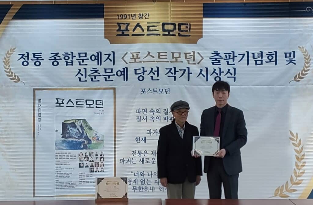 2026년 포스트모던 신춘문예 소설부문 당선작가 이로운 (본명 이형구) 이 수상을 하고 있다