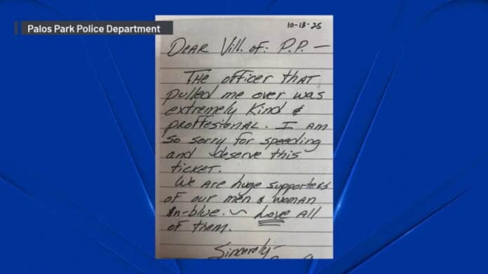 이번 티켓은 팔로스팍 경찰이 발부했으며, 이 감사 편지는 이달 초 경찰서로 전달됐다.