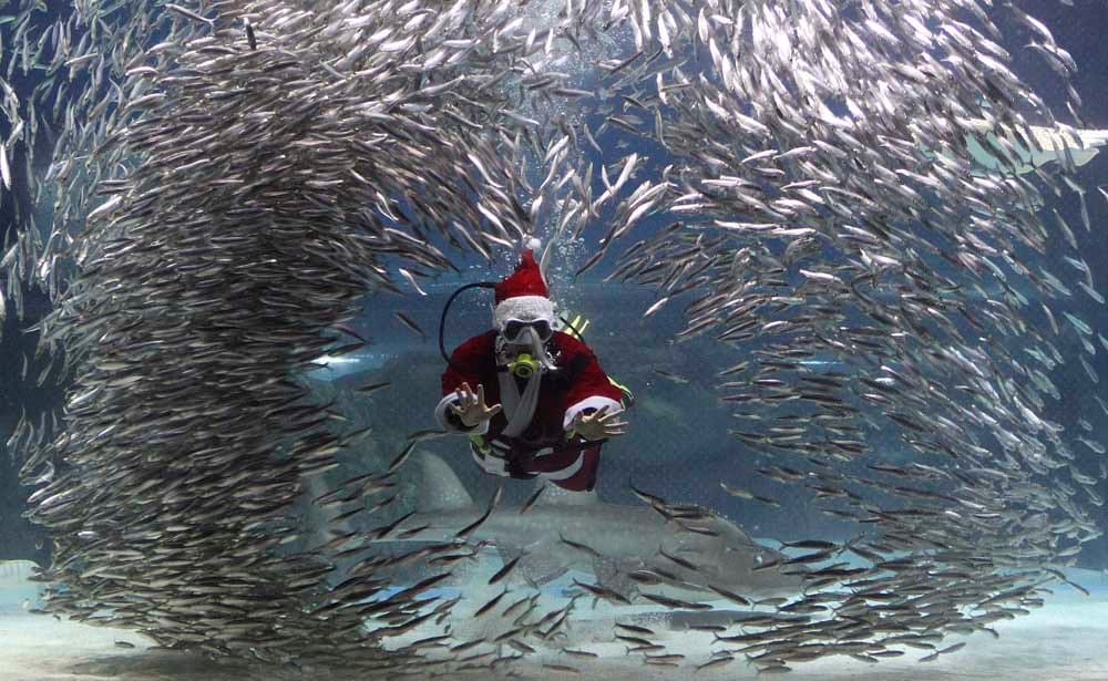 성탄절을 앞두고 방문객들을 위해 다양한 이벤트를 선보이고 있는 서울 코엑스 수족관에서 산타 복장을 한 다이버가 정어리떼와 유영하고 있다.<AP>