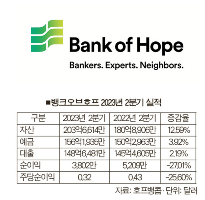 뱅크오브호프(행장 케빈 김)가 2분기 월가 전망치를 상회하는 순이익을 기록했다. 자산과 예금·대출이 전분기 대비 감소했지만 실리콘밸리은행(SVB) 파산으로 비롯된 리저널 뱅크에 대한 시장 우려를 가시게 하는 선방한 실적을 보인 것이다.