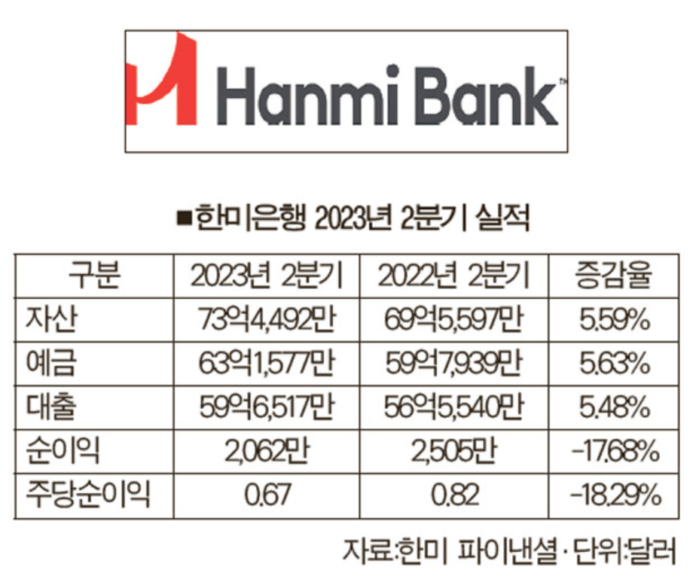 한미은행(행장 바니 이)이 2분기 월가 전망치를 소폭 상회하는 순이익을 기록했다. 뱅크오브호프에 이어 한인 은행들이 시장 우려보다 선방하는 호실적을 보이는 상황이다.