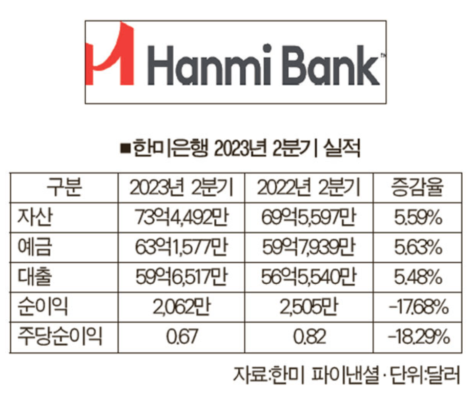 자산과 대출은 직전 분기보다는 줄었지만 안정적인 모습을 보였다. 한미은행의 2분기 총자산은 73억4,492만달러로 전년 동기(69억5,597만달러) 대비 5.59% 성장했다. 대출의 경우 59억6,517만달러로 같은 기간 56억5,540만달러에서 5.48%의 높은 상승률을 기록했다. 자산과 대출은 직전 분기와 비교하면 소폭 감소했는데 최근 미국 경제의 둔화 흐름이 완연한 상황이어서 무리하게 융자를 늘리기보다 리스크 관리를 한 결과로 분석된다.