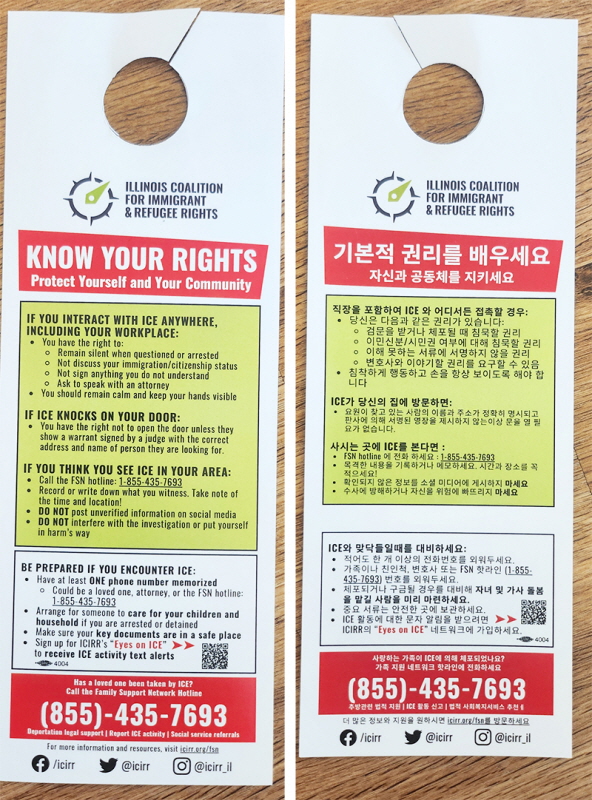살렘 워크 단지에는 최근 모든 유닛 문에 영어와 한국어로 된 ‘이민자 및 난민 권리 안내문(Know Your Rights)’이 부착됐다. 안내문은 일리노이 이민자·난민연합(ICIRR)에서 배포한 것으로, 단속 시 묵비권 유지, 영장 없는 가택 진입 거부, 변호사 접견 요구 등 기본 권리를 안내하고 있다.