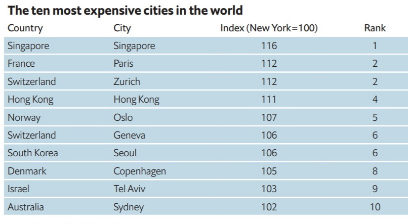 세계에서 물가가 가장 비싼 도시는 싱가포르(116)였다. 이어 파리와 취리히(112), 홍콩(111), 오슬로(107), 제네바와 서울(106), 코펜하겐(105), 텔아비브(103), 시드니(102) 등이 톱 10에 들었다.<표 참조> 싱가포르는 2014년부터 6년째 1위 자리를 지켰고 파리는 5계단, 취리히는 1계단, 오슬로는 6계단이 각각 상승했다. 반면, 홍콩은 2계단이 내려갔다. 물가가 비싼 10위권내 도시를 대륙별로 보면 유럽이 5곳으로 제일 많았고 아시아가 3곳으로 뒤를 이었다.
