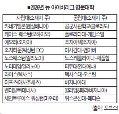경제 전문지 포브스가 2026년 ‘뉴 아이비(New Ivies)’ 대학으로 사립대학 10곳과 공립대학 10곳 등 모두 20개 대학을 선정해 발표했다. 포브스는 인공지능(AI)의 여파로 대학 졸업생들의 취업시장이 흔들리는 환경 속에서도 이들 대학이 새로운 시대에 적응할 졸업생들을 배출시킬 수 있는 신흥 명문대들이라고 소개했다.