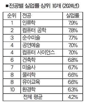 뉴욕 연방은행이 2024년 인구조사국 자료를 분석한 결과, 최근 졸업생(22~27세·학사 이상) 73개 전공 가운데 인류학(7.9%) 전공자의 실업률이 가장 높았다. 이는 전체 전공 평균 실업률 4.2%의 거의 두 배에 해당한다.
