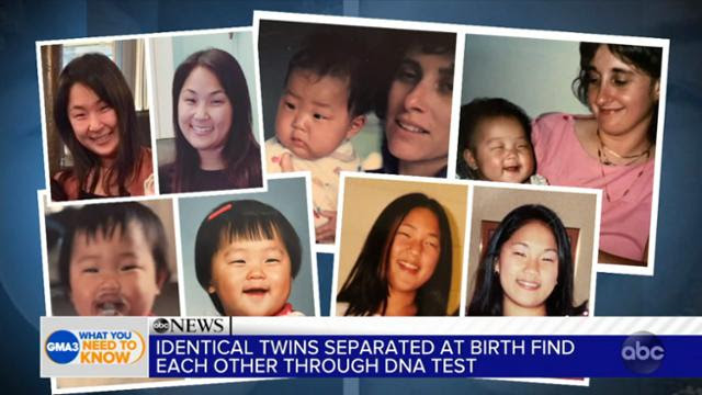 ABC뉴스는 17일, 서로의 존재를 모르고 살아 왔던 한국계 일란성 쌍둥이 자매가 만나게 된 사연을 전했다. 두 사람은 우연히 비슷한 시기에 받게 된 DNA 검사로 쌍둥이 자매의 존재를 알게 됐다. 주인공은 펜실베니아주 필라델피아에 사는 에밀리 부시넬과 플로리다주에 사는 몰리 시너트다. 두 사람은 생후 3개월에 각자 다른 미국 가정에 입양됐다. 이들은 미국으로 건너오게 된 사연도, 쌍둥이 자매의 존재도 모른 채 지내 왔다.