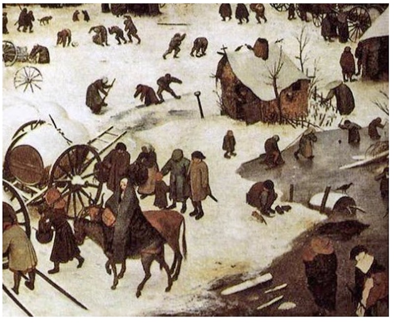 성경 이야기를 농민의 일상으로 재구성한 브뤼헐의 시각 언어는 그의 예술적 고백이자 기록이다. 평화롭고 정겨운 마을 풍경과 눈 덮인 길은 당대 농민의 핍박받는 삶을 은유하는 장치이기도 하다. 요셉이 향하는 여인숙의 인구조사관은 당시 네덜란드를 지배하던 스페인의 세금 징수원이며, 여관 외벽 붉은 독수리 문장은 스페인 펠리페 2세 합스부르크 가문의 문장이다. 나병, 소빙하기의 혹한, 과도한 세금, 종교적 갈등 등 당시 농민의 삶은 처참했다.