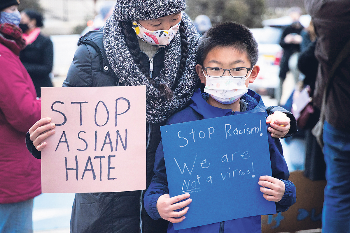 아시안 대상 증오에 맞서야 한다는 증오범죄 규탄 시위가 벌어진 가운데 지난 17일 필라델피아에서 한인 멜리사 민씨와 아들 제임스 군이 ‘아시안 증오를 멈춰라’ ‘인종차별을 멈춰라! 우리는 바이러스가 아니다’라는 피켓을 들고 시위를 벌이고 있다.[로이터]