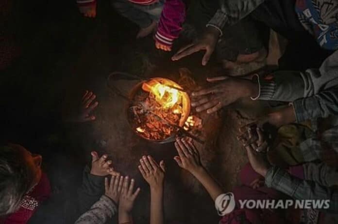 추위에 모닥불로 손 녹이는 가자 피란민들 [AP=연합뉴스]