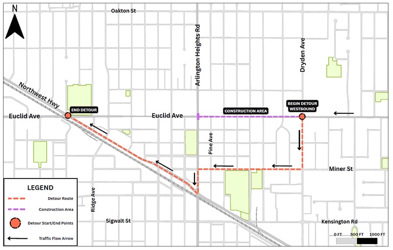 알링턴 하이츠 빌리지에 따르면, 서쪽 방향의 차량은 드라이든 애비뉴를 따라 남쪽으로, 마이너 스트리트 (Miner St)를 거쳐 알링턴 하이츠 로드를 따라 남쪽으로 지나고, 이후 노스웨스트 하이웨이(Northwest Highway)로 우회해 다시 유클리드 애비뉴 (Euclid Avenue)로 돌아올 수 있도록 설정된다. 동쪽 방면 차선은 정상적으로 운행된다.