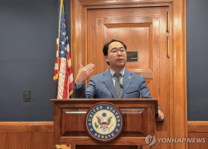 (워싱턴=연합뉴스) 앤디 김 연방 상원의원이 10일 워싱턴 DC의 의회 건물에서 언론 간담회를 진행하고 있다. 2025.12.10